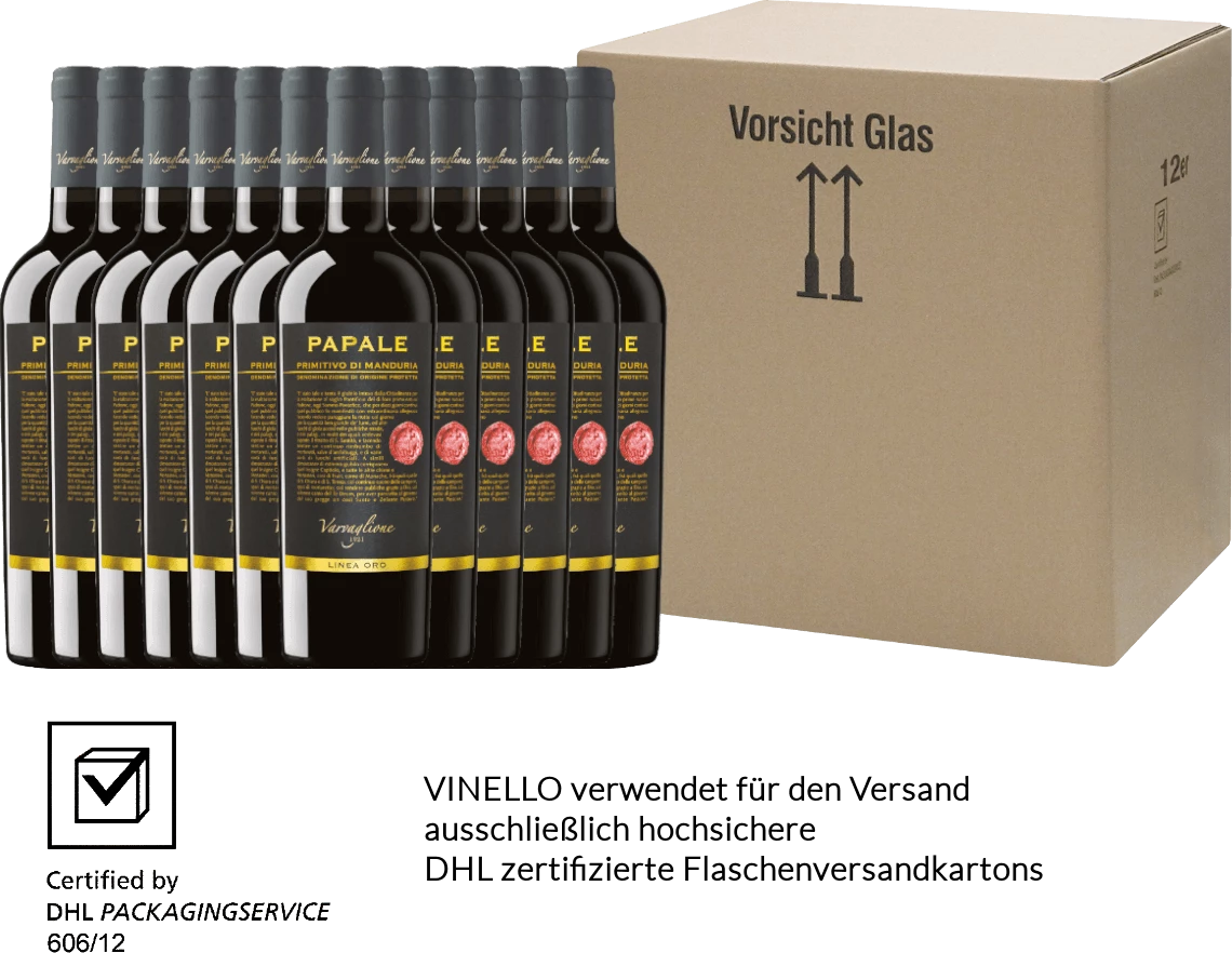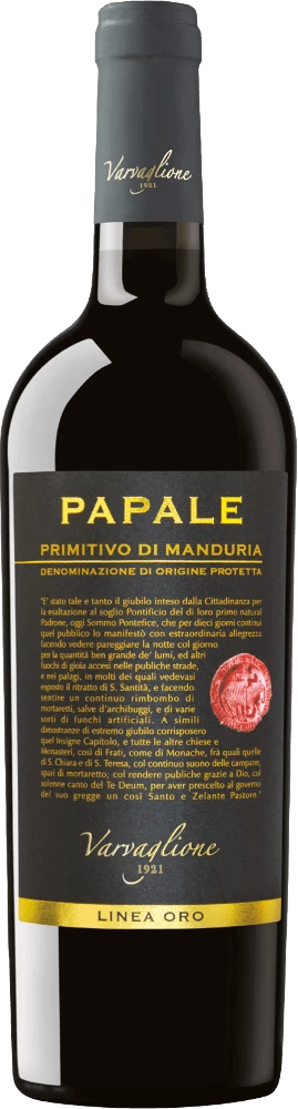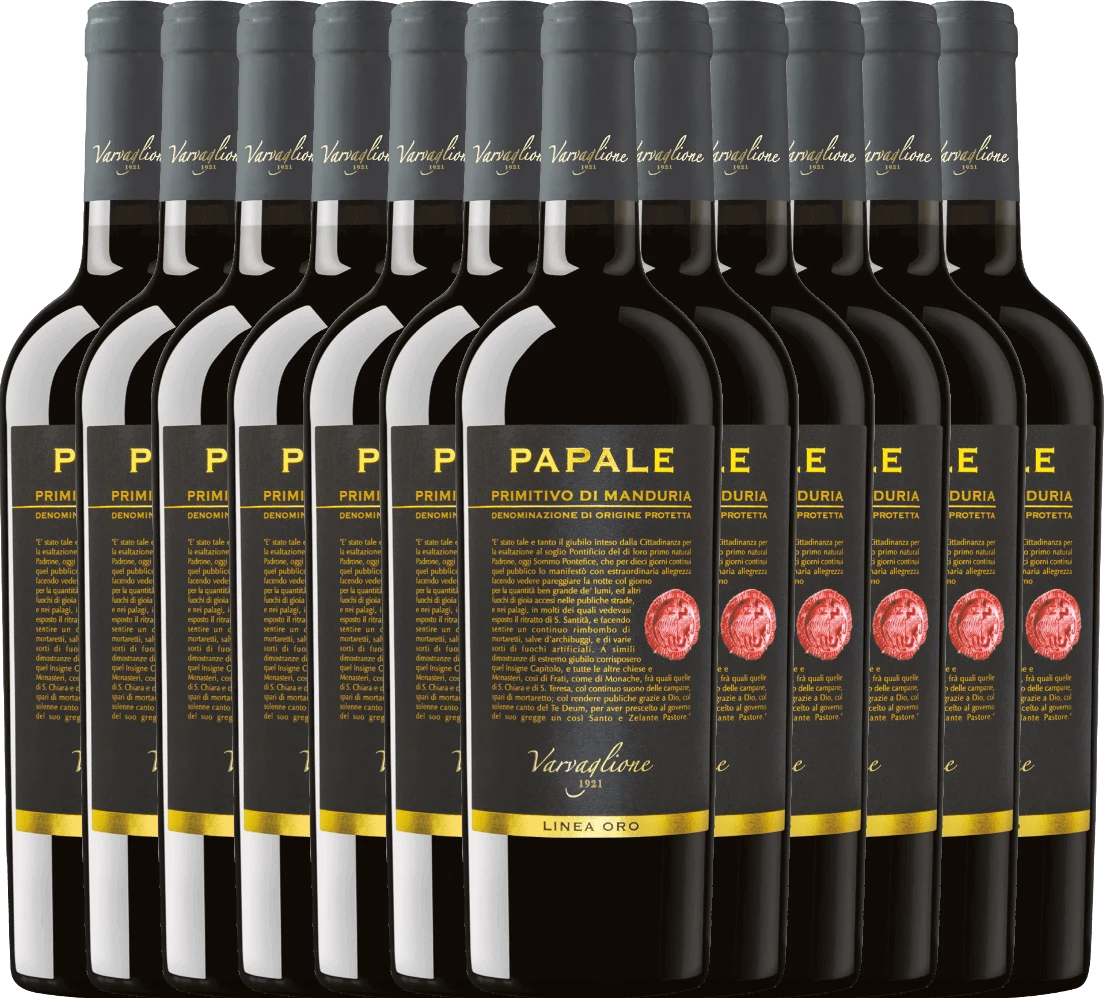 Der Papale Linea Oro Primitivo di Manduria von Varvaglione aus dem sonnigen Apulien überzeugt mit seinem dichten, konzentrierten, komplexen und ausgezeichneten Charakter. Reife Beerenfrüchten ergänzt und würzige Noten umschmeicheln die Nase. Am Gaumen wundervoll füllig mit einer perfekten Harmonie zwischen feiner Fruchtsüße und weichen Tannin.Â