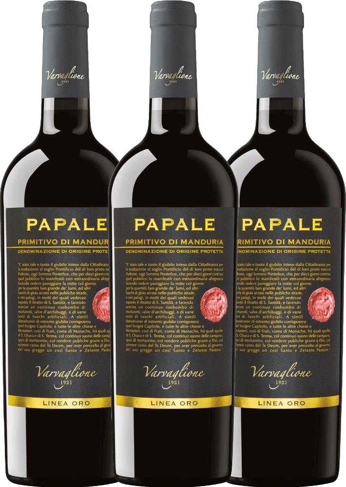 Der Papale Linea Oro Primitivo di Manduria von Varvaglione aus dem sonnigen Apulien überzeugt mit seinem dichten, konzentrierten, komplexen und ausgezeichneten Charakter. Reife Beerenfrüchten ergänzt und würzige Noten umschmeicheln die Nase. Am Gaumen wundervoll füllig mit einer perfekten Harmonie zwischen feiner Fruchtsüße und weichen Tannin.