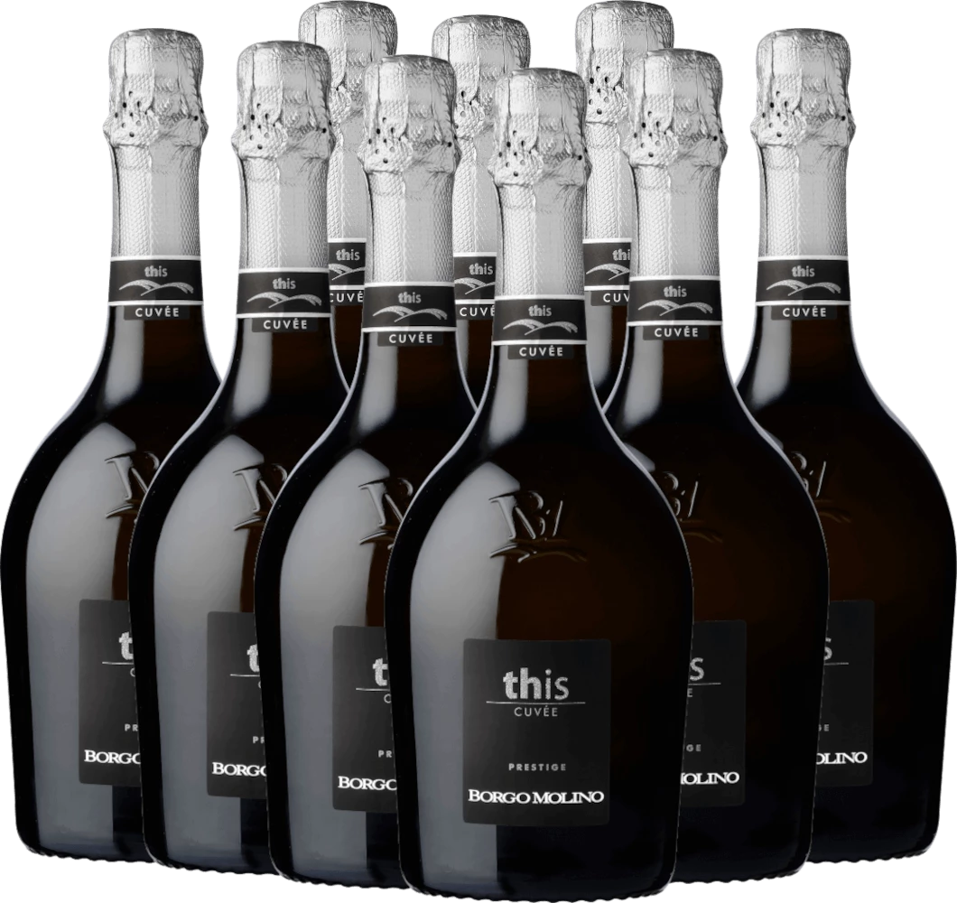 Mit dem Borgo Molino 9er Paket Cuvee This Brut kommt ein erstklassiger Schaumwein ins Weinglas. Hierin offeriert er eine wunderbar brillante, platingelbe Farbe. Die Perlung dieses Schaumweins glĂ€nzt im Glas ungemein fein, elegant und lang anhaltend. In der Mitte geht der Ton ĂŒber in eine ausdrucksstarke Farbe. Gibt man ihm im Glas durch Schwenken etwas Luft, so zeichnet sich dieser Schaumwein durch eine herrliche Brillanz aus, die ihn schwungvoll im Glas tanzen lĂ€sst. Der 9er Paket Cuvee This Brut von Borgo Molino ist perfekt fĂŒr alle Weinenthusiasten, die es trocken mögen. Dabei zeigt er sich aber nie karg oder spröde, sondern rund und geschmeidig. Das Finale dieses Schaumweins aus der Weinbauregion Venetien besticht schlieĂlich mit beachtlichem Nachhall. Der Abgang wird zudem von mineralischen AnklĂ€ngen der von Kies und Mergel dominierten Böden begleitet.