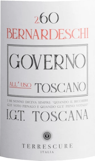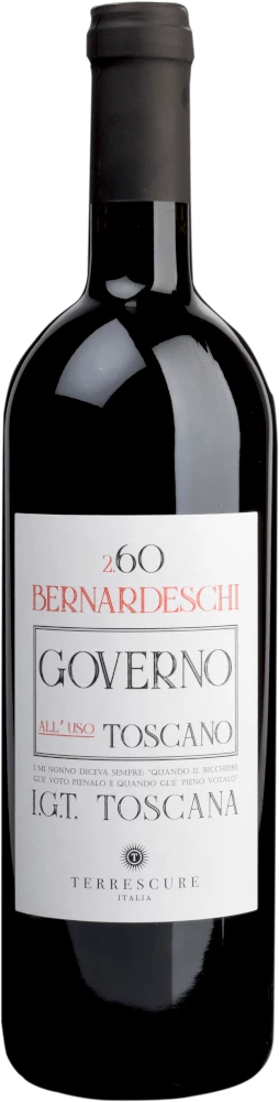 Grundlage für die erstklassige und wunderbar balancierte Cuvée Bernardeschi 2.60 Governo all uso Toscano von Terrescure sind Cabernet Sauvignon, Merlot und Sangiovese Trauben. Zum Zeitpunkt optimaler Reife werden die Trauben für den Bernardeschi 2.60 Governo all uso Toscano ohne die Hilfe grober und wenig selektiver Maschinen ausschließlich händisch gelesen. Nach der Weinlese gelangen die Weintrauben zügig ins Presshaus. Hier werden Sie sortiert und behutsam gemahlen. Anschließend erfolgt die Gärung im großes Holz bei kontrollierten Temperaturen. Nach ihrem Ende wird der Bernardeschi 2.60 Governo all uso Toscano noch für 14 Monate in großes Holzfass aus Eichenholz ausgebaut. Dem Ausbau im Holzfass folgt noch eine beachtliche Flaschenreifung, was diesen Rotwein noch komplexer macht.
