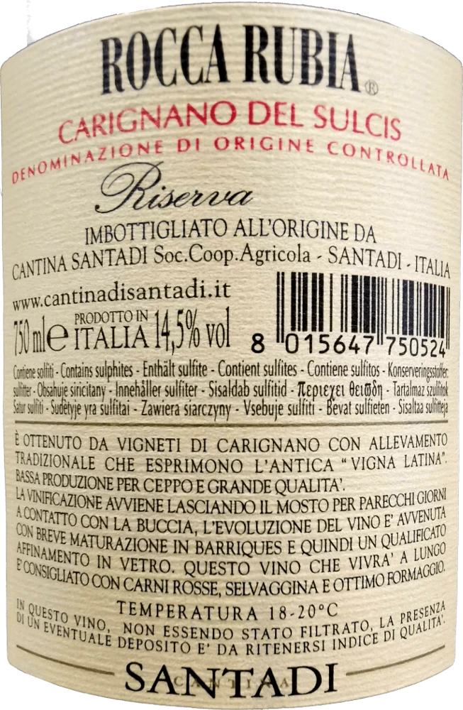 Die Trauben für den kraftvollen Rocca Rubia Riserva Carignano del Sulcis DOC von Cantina di Santadi stammen von den Weinbergen in der Nähe der Mittelmeerküste der Sulcis-Region im Südwesten Sardiniens. Der Wein wird aus 100% Carignano gekeltert, die in der Region Sulcis im Südwesten Sardiniens als Bäumchen nach alter Manier der Lateinischen Rebe erzogen. Auf den sandig-lehmigen und kargen Böden gedeihen die Trauben für diesen kraftvollen, an Tanninen reichen Wein bestens.